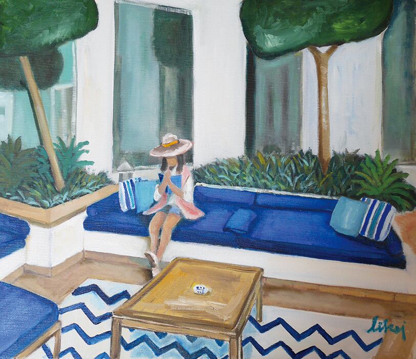 青いソファで読書(フレーム付)F10号